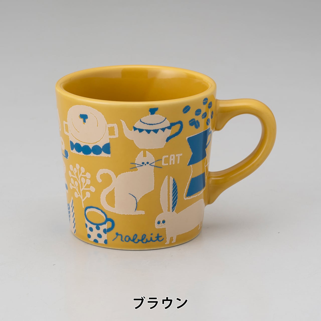 北欧風のネコとキッチン用品のデザインをあしらった、おしゃれなマグカップ。