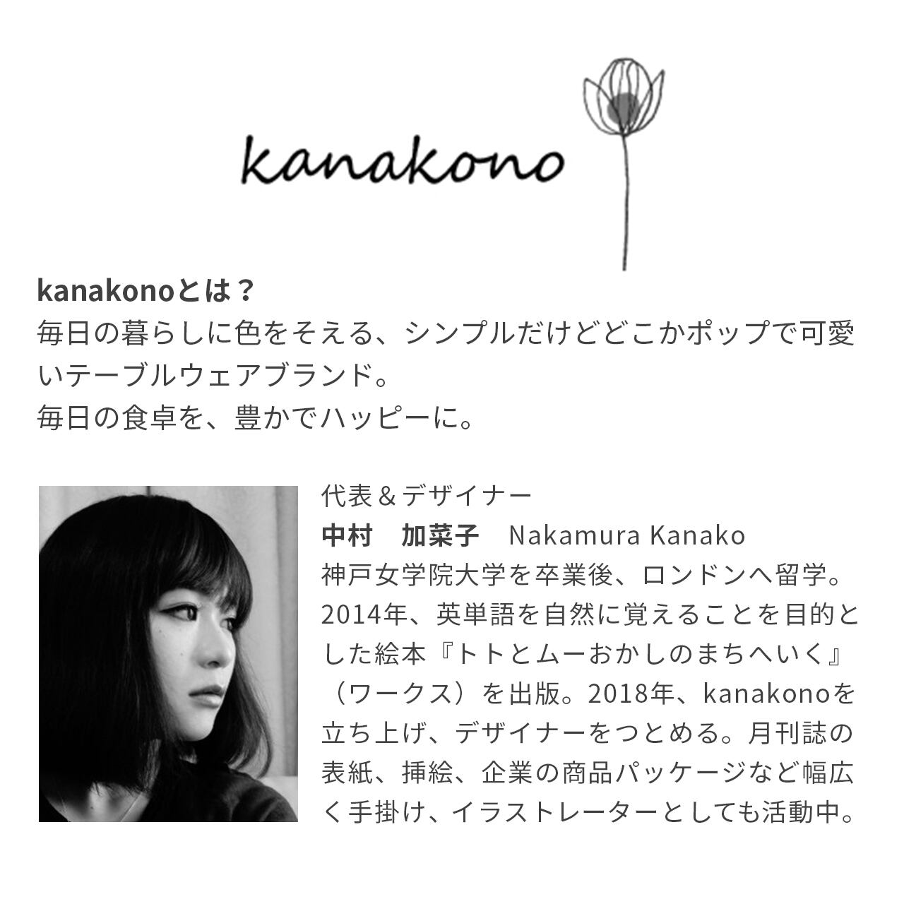 神戸女学院大学を卒業後、ロンドンへ留学。子供に絵本を読み聞かせたことを機に、海外絵本に興味を持つ。英語嫌いな自分が、絵本を通して自然と英単語を覚えた経験から、帰国後「英語」を使った子供のための「しかけ絵本」や「単語カード」などを制作する。
